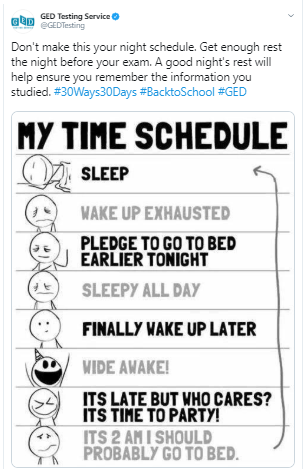 Every day this month GED Testing Service will be sharing back-to-school anecdotes, study tips and time-saving tricks on our Twitter and Facebook pages.